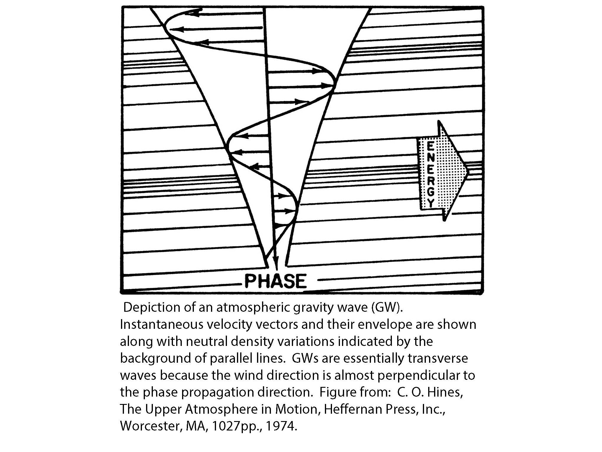 In the earth’s atmosphere, compressional and gravitational forces (i.e., buoyancy forces) combine to produce upwardly propagating waves known as atmospheric gravity waves (GWs). Because of their compressional component, these waves are sometimes referred to as acoustic-gravity waves. However, they are distinct from acoustic waves, which have much smaller spatial dimensions. Waves with only gravity as the restoring force occur on the surface of the ocean (ocean gravity waves), but in the atmosphere where density varies gradually with altitude, the waves exist in the medium and have a compressional component. In the troposphere/stratosphere, GWs generate relatively small perturbations in wind speed, temperature, and density. However, the vertical flux of wave energy is proportional to the product of atmospheric density and the wind speed-squared. Thus, as the waves propagate to greater heights where atmospheric density is lower, wind speeds become greater. Classic sources of GWs in the lower atmosphere include strong thunderstorms and mesoscale convective systems, air flow over mountains and other orographic features, perturbations in the jet stream, tsunamis, earthquakes, and volcanoes. Sources at high altitudes include variations in Joule and particle heating rates in the auroral region, nonlinearities in upwardly propagating atmospheric tides, and the passing of the terminator during a solar eclipse. GW periods range from 5 min to several hours, and their horizontal wavelengths extend from several kilometers to roughly 1000 km. A pictorial representation of a GW is presented below.