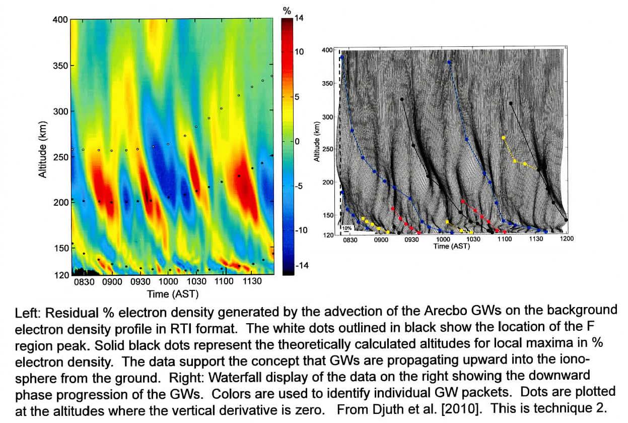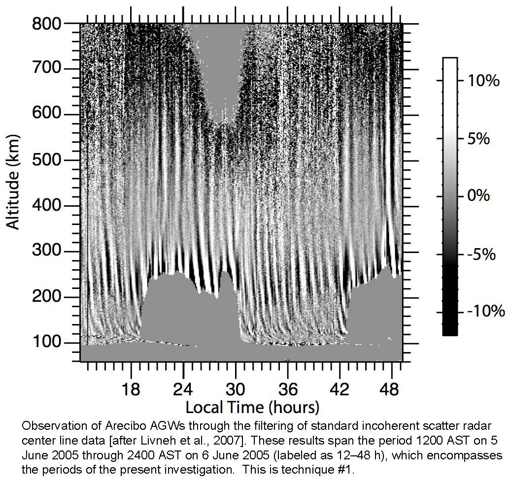 As a GW travels to heights of ~100 km (about 63 miles) and greater, the wave couples to the background ionization (i.e., the ionosphere). At Arecibo Observatory (18.24° N, 66.75° W) significant ionization is present above ~100 km (63 miles) altitude during the daytime and above 200 km during the night. At these altitudes, the gravity waves generate imprints on the background ionization and can readily be detected with the powerful Arecibo 430 MHz radar. This is the most sensitive radar in the world. It is commonly referred to as an incoherent scatter radar or Thomson scatter radar. At 430 MHz, the backscatter echo near the radar center frequency originates from groups of electrons that shield ions in the charge-neutral ionospheric plasma. The motion of the electrons is therefore tied to the movement of the ions, and the echo bandwidth is only about 10 kHz. This center line backscatter provides a direct measurement of electron density versus altitude. A second technique used to monitor the electron density profile at Arecibo entails measurements of plasma wakes that occur when photoelectrons speed through the ionosphere. These echoes occur only during the daytime and are offset by ~3-12 MHz from 430 MHz. This second technique yields the best possible altitude and temporal resolution. A more detailed discussion of the two measurement techniques is available in the following journal references: